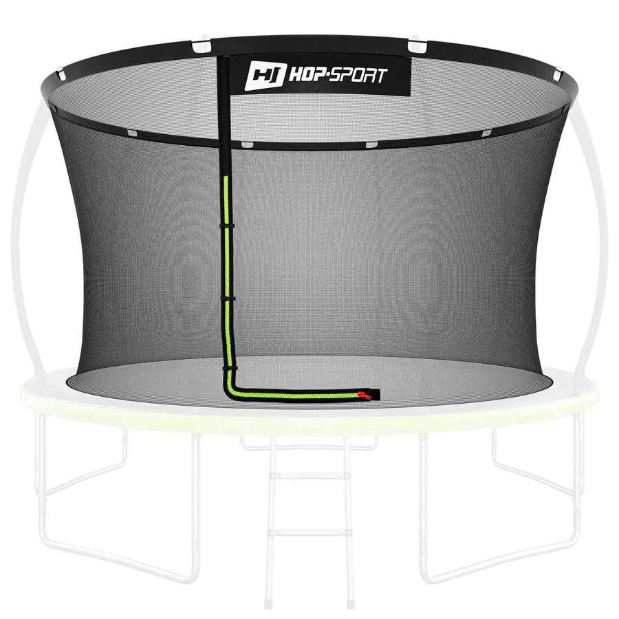 Wejście wykonano w kształcie litery L, co ułatwia wchodzenie i wychodzenie z trampoliny. Płynnie działający zamek błyskawiczny w kolorze zielonym jest odporny na intensywne użytkowanie. Dodatkowe klamry stabilnie blokują wejście, aby siatka przypadkowo się nie otwierała, nawet podczas dynamicznych skoków.