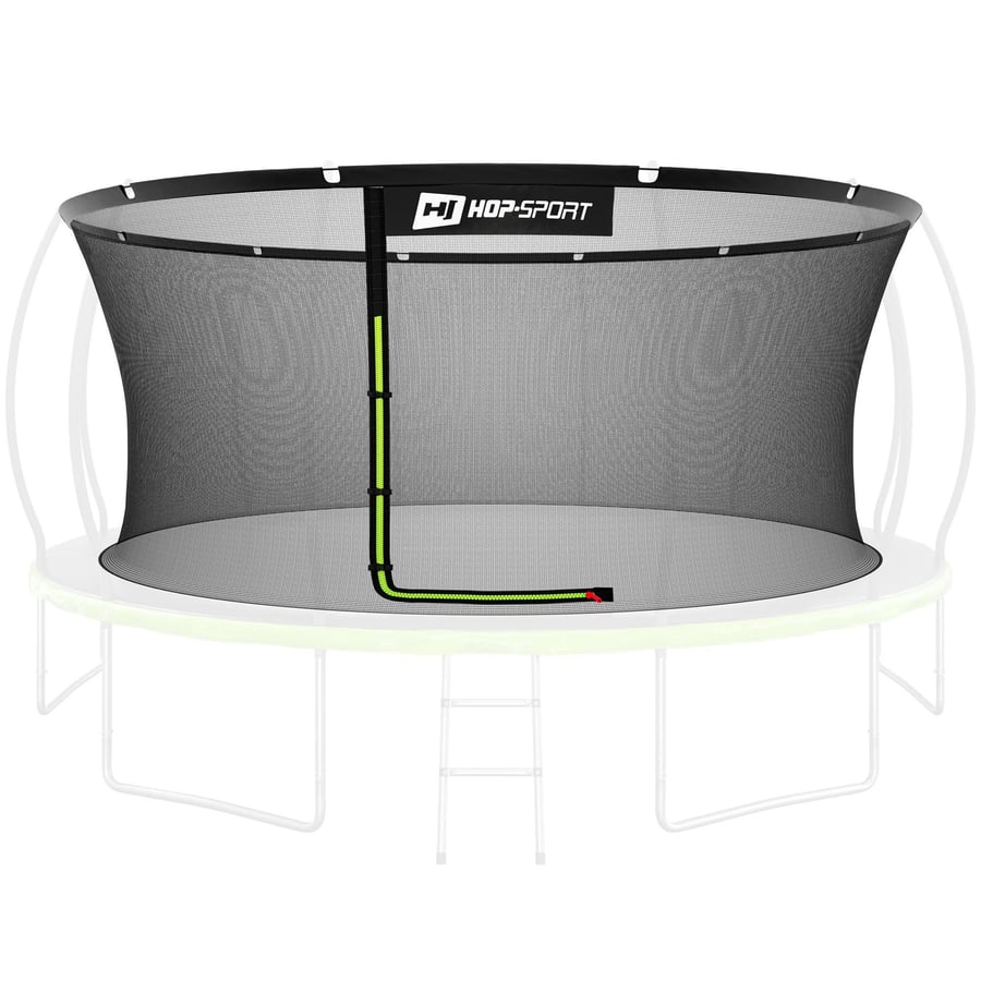 Wejście wykonano w kształcie litery L, co ułatwia wchodzenie i wychodzenie z trampoliny. Płynnie działający zamek błyskawiczny w kolorze zielonym jest odporny na intensywne użytkowanie. Dodatkowe klamry stabilnie blokują wejście, aby siatka przypadkowo się nie otwierała, nawet podczas dynamicznych skoków.
