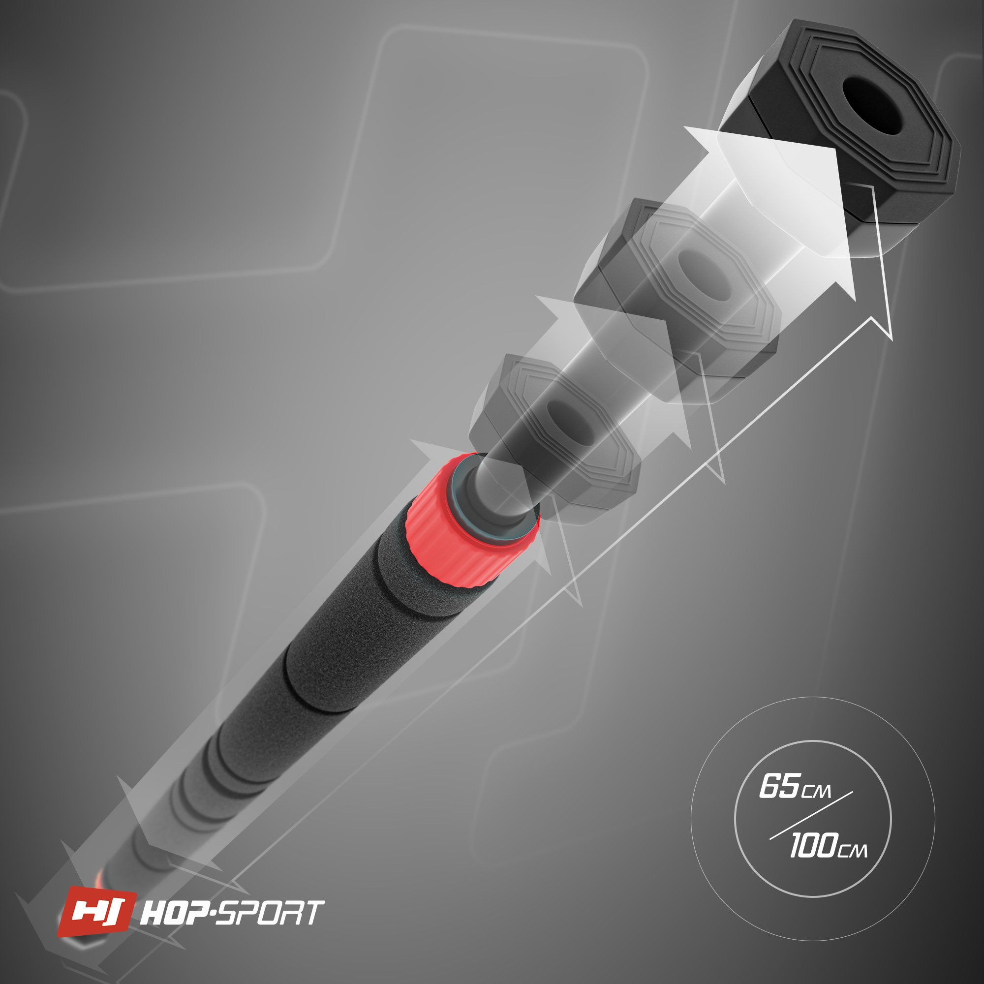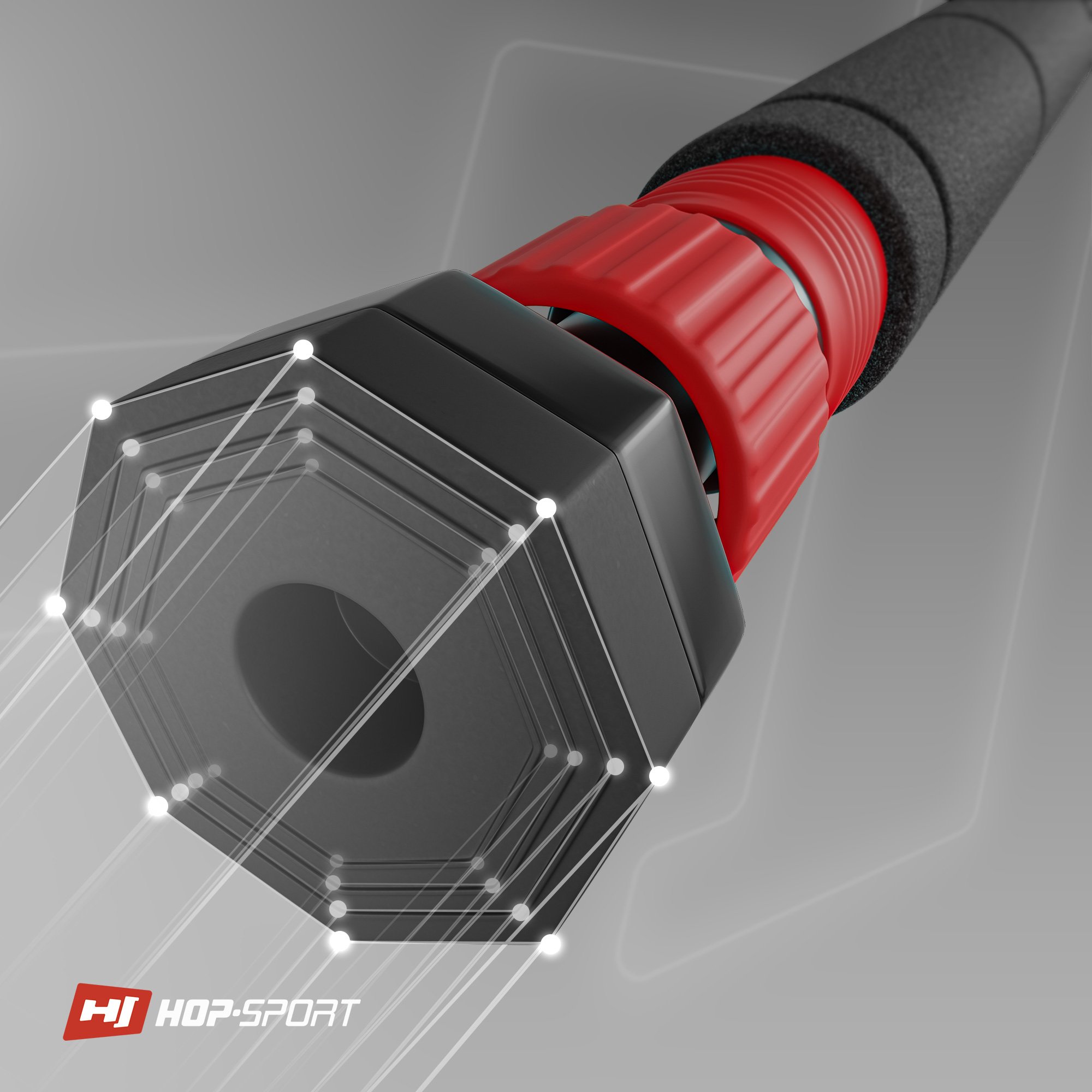Drążek rozporowy Hop-Sport posiada aż 8 punktów nacisku, umieszczonych na antypoślizgowych gumowych stopkach. To rozwiązanie zapewnia drążkowi znacznie lepszą przyczepność do futryny, niż system oparty tylko na jednym punkcie nacisku.