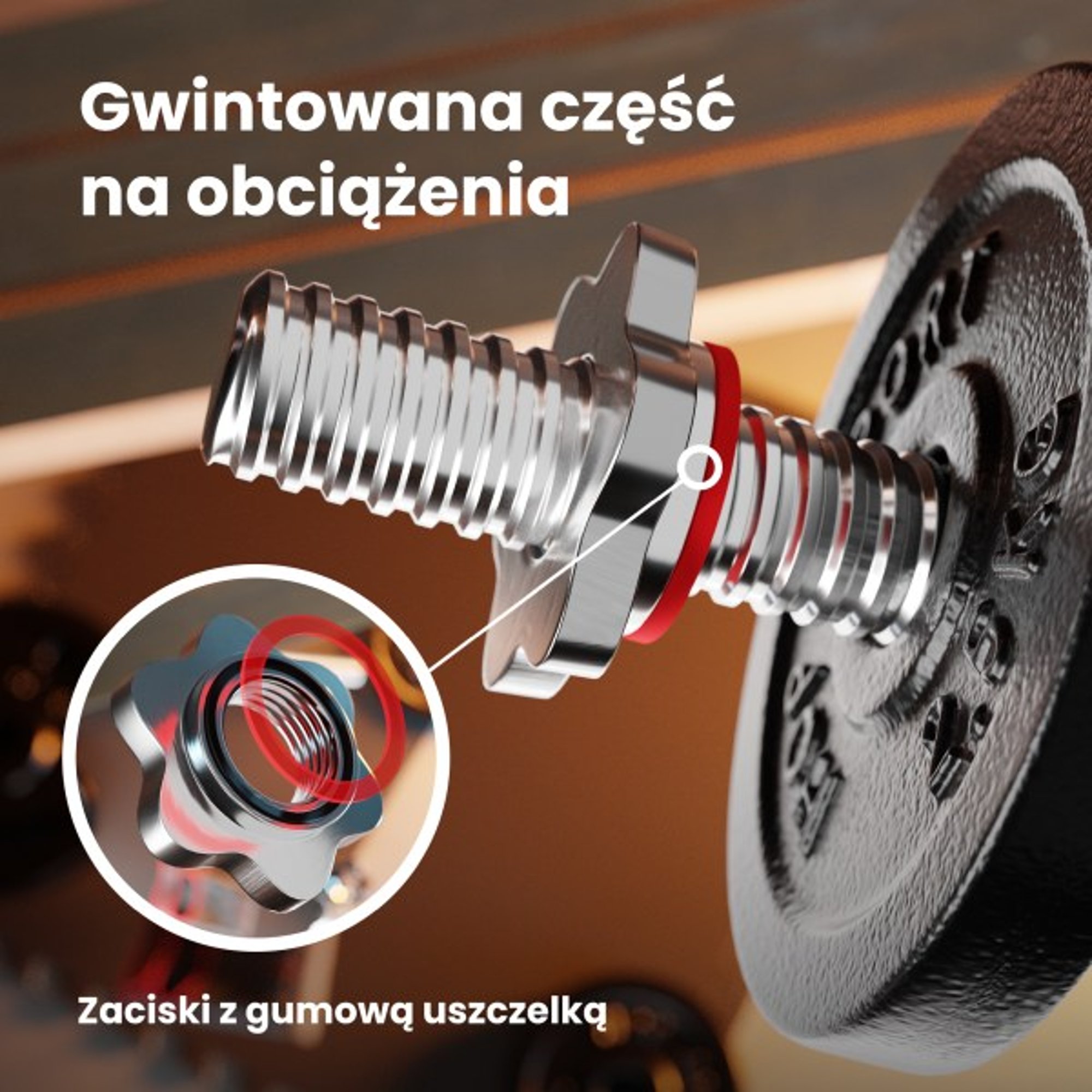 Gryf wyposażono w specjalne końcówki o gwintowanej powierzchni. Włożone na nie obciążenie nie kołysze się i nie zsuwa nawet podczas intensywnych ćwiczeń. Dodatkowo obciążenie można zabezpieczyć chromowanymi nakrętkami, które je dociskają. Posiadają one gumowe uszczelki, które jeszcze lepiej stabilizują podnoszony przez nas ciężar.