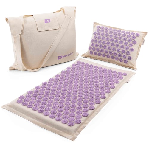 Zestaw do akupresury (w fioletowym wariancie kolorystycznym) producenta Hop-Sport to proste w użyciu i skuteczne narzędzie do relaksacji. Poprzez swoje działanie pomaga usuwać wiele napięć mięśniowych, poprawia krążenie krwi oraz wpływa na ogólną kondycję organizmu. Komplet do akupresury Hop-Sport (mata + poduszka) wyposażony łącznie w 261 specjalnie zaprojektowanych rozetek z tworzywa sztucznego, posiadających 7830 kolców, które zapewniają intensywny, odprężający masaż całego ciała.
