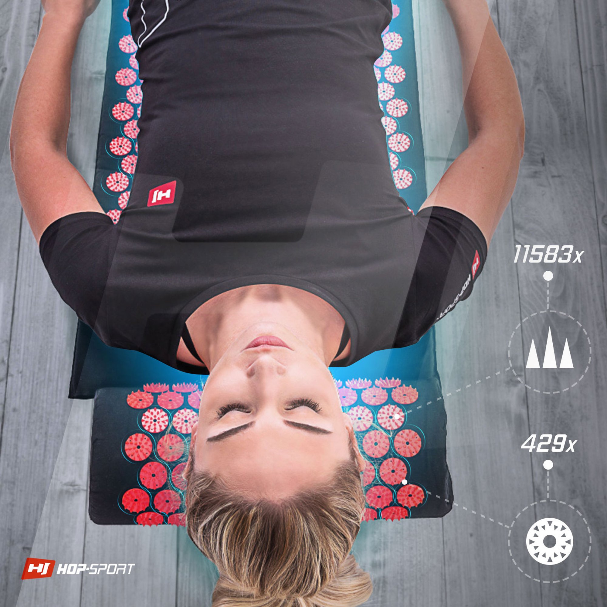 Razem, na macie i poduszce do akupresury Hop-Sport znajduje się 429 rozetek, na których umieszczono aż 11583 punktów ucisku (kolców). Specjalny kształt i odpowiednia gęstość ułożenia rozetek na macie sprawia, że kolce zapewniają optymalny ucisk ciała użytkownika.