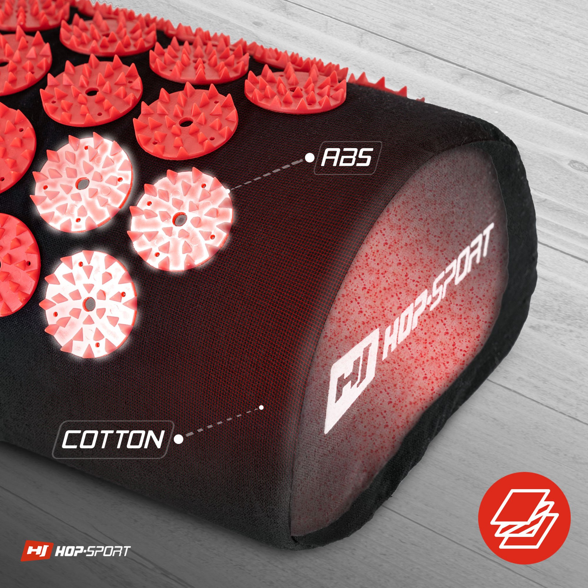 Zestaw do akupresury Hop-Sport wykonany jest ze 100% bawełny z wkładem z miękkiej gąbki. Rozety masujące wyprodukowano z bezpiecznego tworzywa sztucznego (ABS). Poszewka poduszki jest zdejmowana, wobec czego w razie potrzeby możesz ją wyprać ręcznie w delikatnym środku piorącym (uwaga - nie należy prać poszewki w pralce oraz suszyć jej w suszarce elektrycznej).