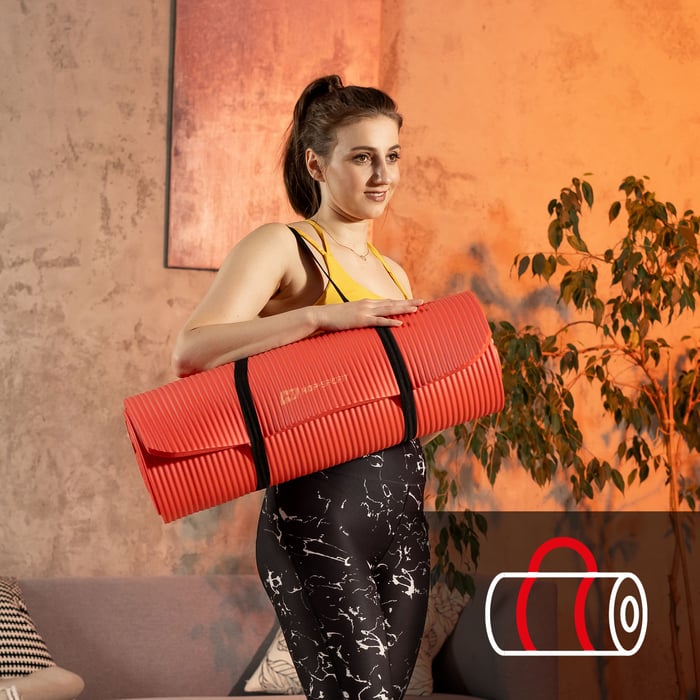 Matę Hop-Sport możesz wygodnie zabierać ze sobą na zajęcia jogi, fitnessu, do parku lub na plażę. Nie potrzebujesz do tego specjalnej torby ani pokrowca. W komplecie z matą NBR 1,5 cm otrzymasz pasek transportowy, który ułatwi Ci zabranie jej ze sobą, gdzie tylko potrzebujesz.