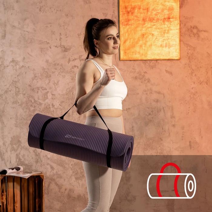 Matę Hop-Sport możesz wygodnie zabierać ze sobą na zajęcia jogi, fitnessu, do parku lub na plażę. Nie potrzebujesz do tego specjalnej torby ani pokrowca. W komplecie z matą NBR 1,5 cm otrzymasz pasek transportowy, który ułatwi Ci zabranie jej ze sobą, gdzie tylko potrzebujesz.