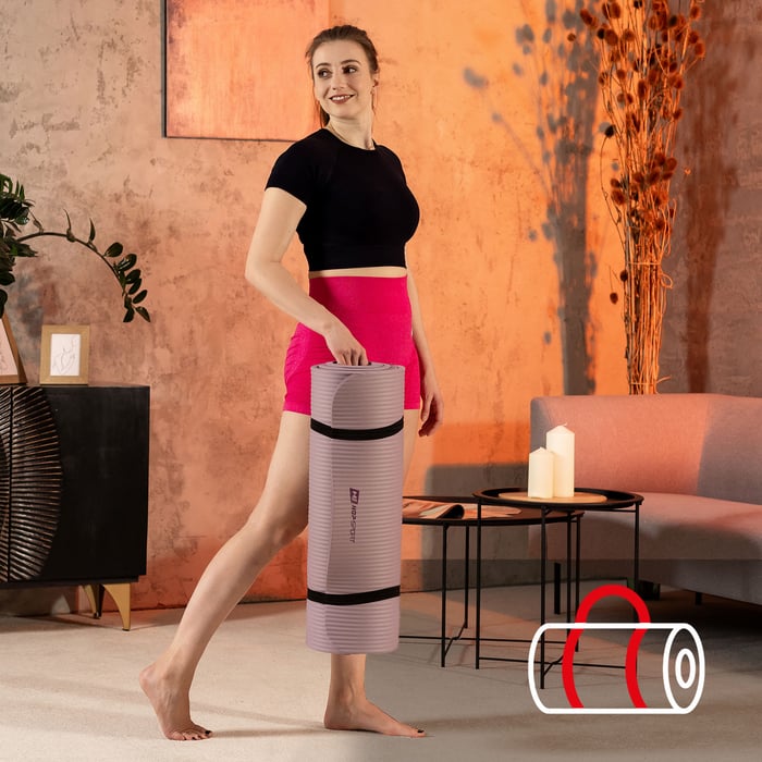 Matę Hop-Sport możesz wygodnie zabierać ze sobą na zajęcia jogi, fitnessu, do parku lub na plażę. Nie potrzebujesz do tego specjalnej torby ani pokrowca. W komplecie z matą NBR 1,5 cm otrzymasz pasek transportowy, który ułatwi Ci zabranie jej ze sobą, gdzie tylko potrzebujesz.