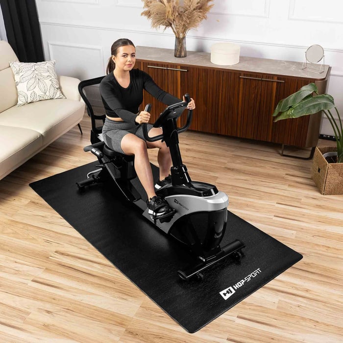 Uniwersalny czarny kolor i nowoczesny, minimalistyczny design maty ochronnej PVC Hop-Sport sprawia, że pasuje ona do wnętrza każdego wnętrza i każdego domowego kącika fitness.