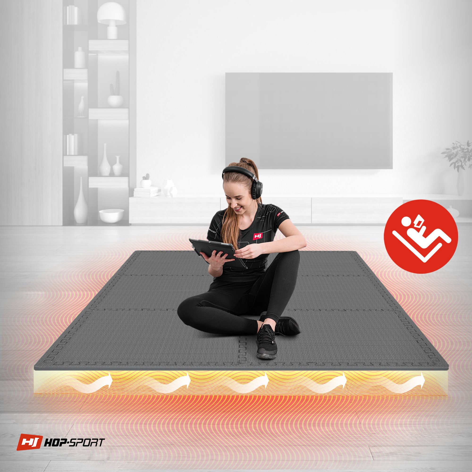 Mata HS-A010PM, dzięki 1 cm grubości, stanowi doskonałe zabezpieczenie dla podłóg z paneli, drewna lub płytek ceramicznych. Zmniejsza ryzyko zarysowania lub zabrudzenia podłoża sprzętem treningowym lub akcesoriami siłowymi. Ponadto, mata zwiększa amortyzację i stabilność ustawionego na niej sprzętu. Skutecznie redukuje hałas i drgania, które powstają w trakcie intensywnego treningu. Mata Puzzle dzięki optymalnej twardości i sprężystości materiału świetnie nadaje się do ćwiczeń gimnastycznych, takich jak aerobik, fitness, pilates, czy joga. Matę można stosować również jako podłoże podczas treningu karate lub judo. Antypoślizgowy materiał chroni przed kontuzjami.