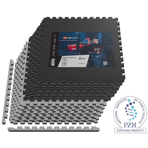 Mata Puzzle EVA 2cm 12 sztuk HS-A020PM czarno/szara to uniwersalny produkt, który zapewni ochronę podłoża podczas domowych treningów i nie tylko!