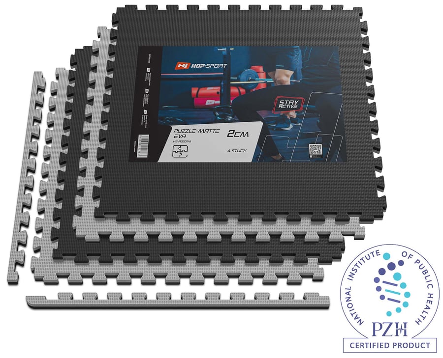 Mata Puzzle EVA 2cm 4 sztuki HS-A020PM czarno/szara to uniwersalny produkt, który zapewni ochronę podłoża podczas domowych treningów i nie tylko!