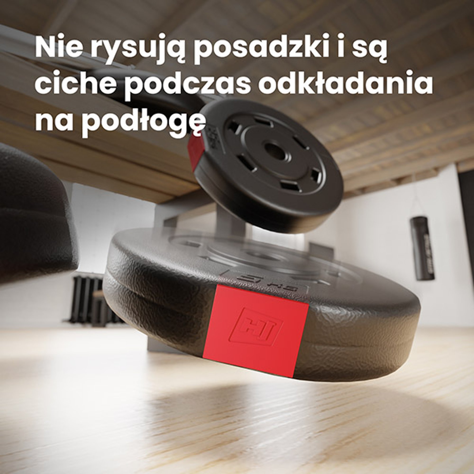 Dla jeszcze większej wygody treningowej obciążenia kompozytowe zbudowano w taki sposób, że jedna z krawędzi talerzy jest ścięta. Zaślepka skutecznie blokuje obciążenia w pozycji pionowej, dzięki czemu ciężar zabezpieczony jest przed przypadkowym toczeniem się , co wpływa nie tylko na wygodę, ale również bezpieczeństwo ćwiczącego.