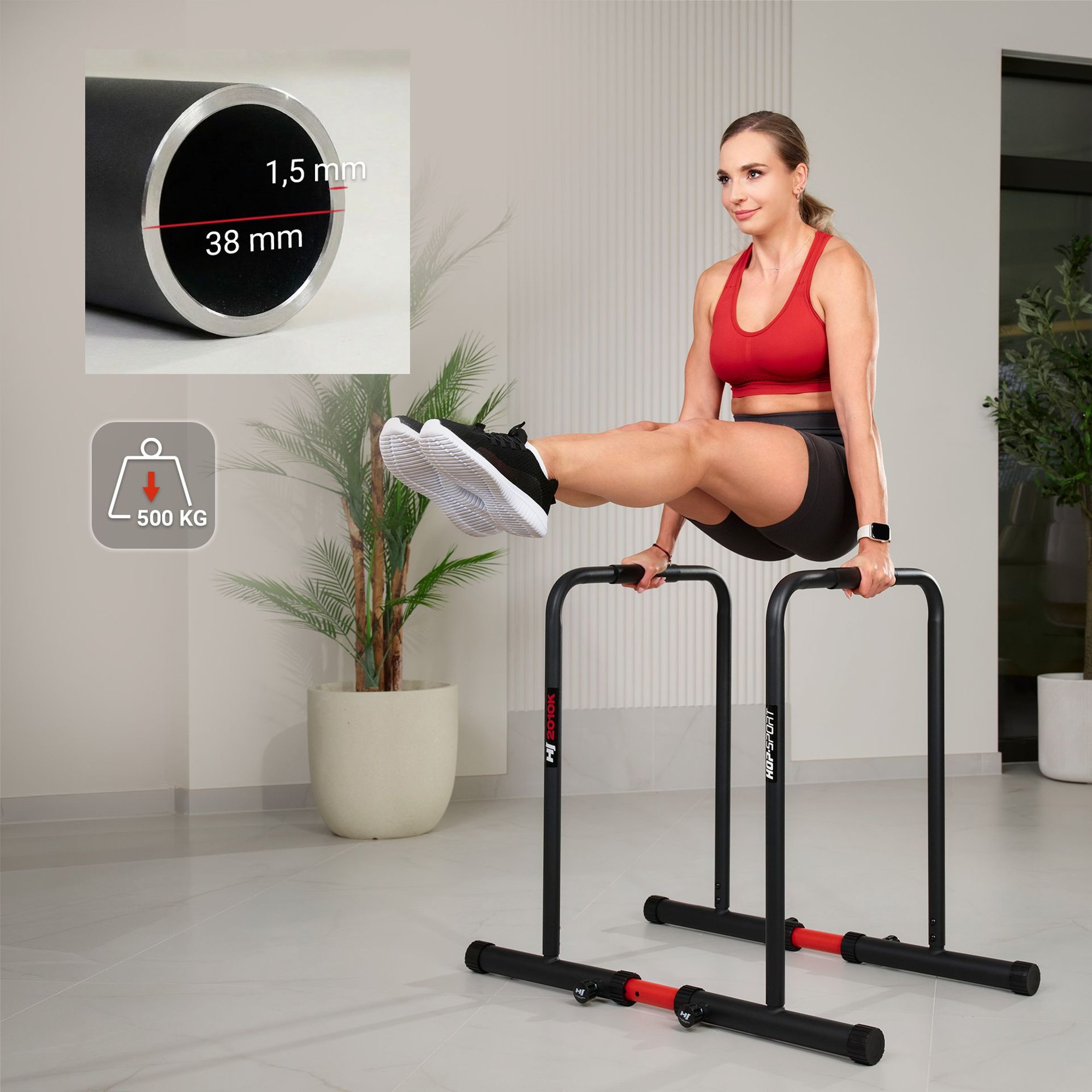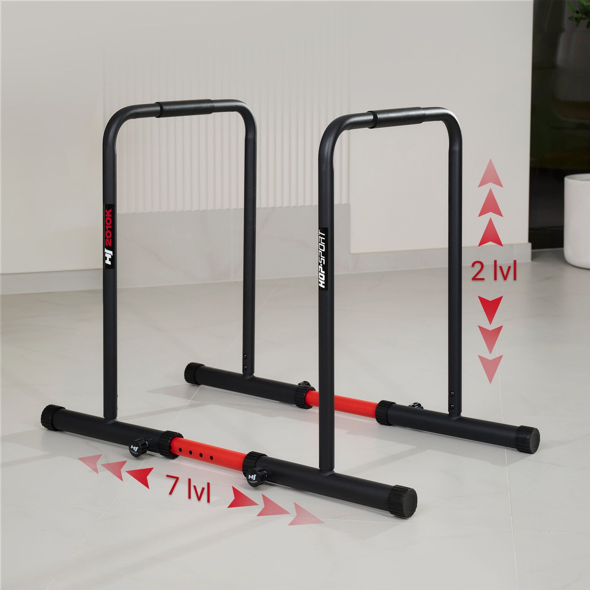 HS-2010K to regulowane poręcze do ćwiczeń dipów. Z antypoślizgowymi uchwytami i stopkami. Świetne do kalisteniki w domu.