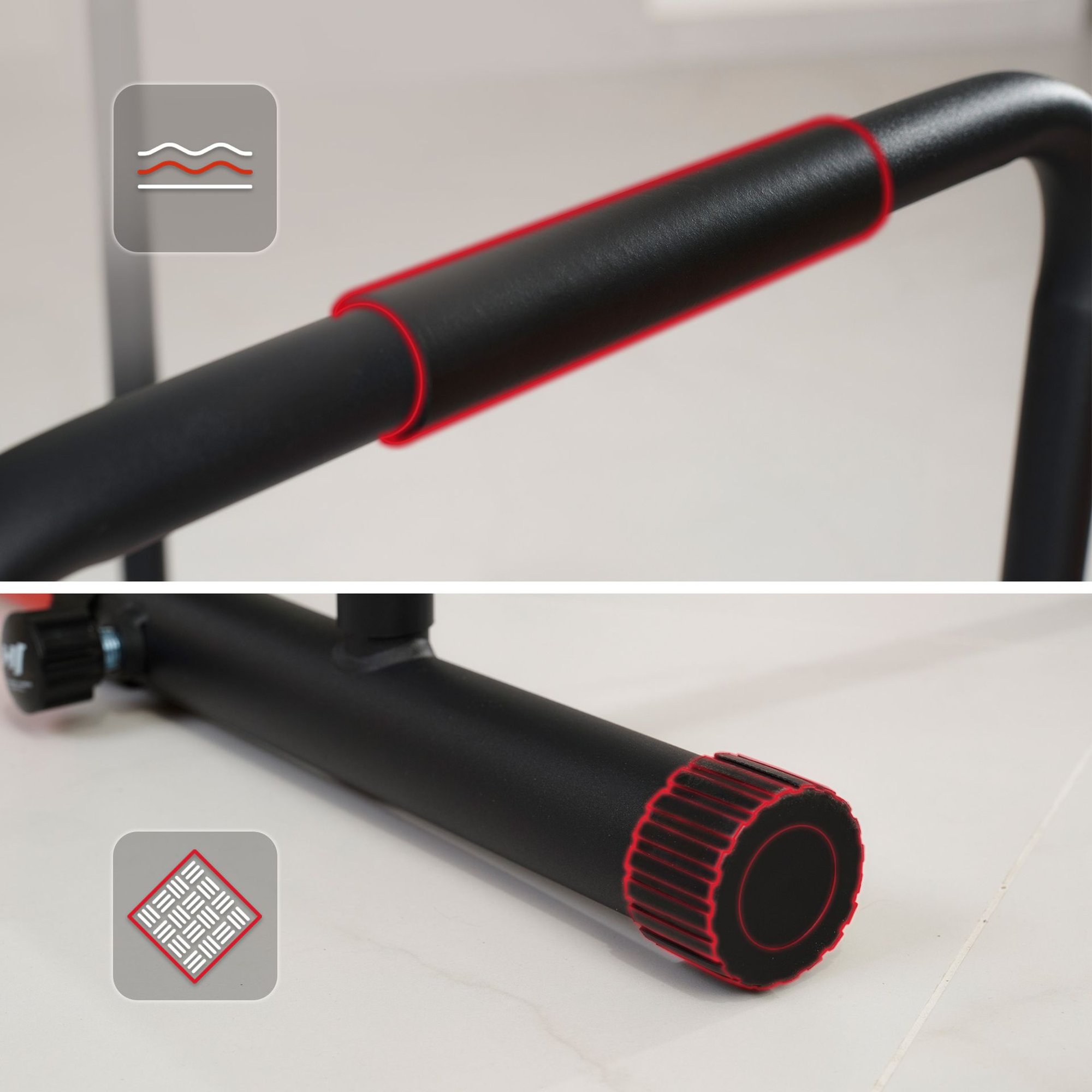 Bez względu na to, czy wykonujesz klasyczne dipy, czy L-sity – antypoślizgowe uchwyty i stopki zapewniają Ci pewny chwyt i stabilność na każdej powierzchni. Trenuj bez obaw o przesuwanie się sprzętu lub utratę kontroli – poręcze do pompek HS-2010k pozwalają się skupić na technice i ruchu.