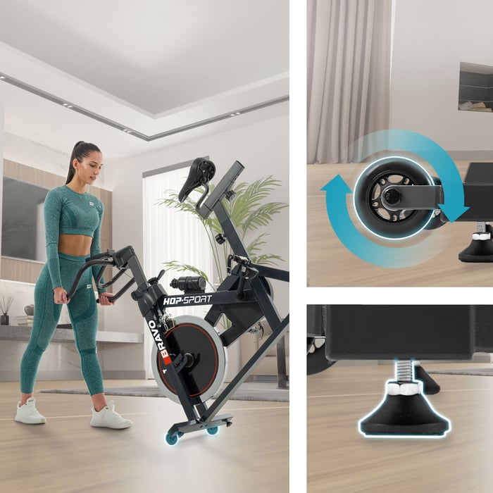 Rower spiningowy Indoor Cycling HS-045IC Bravo to sprzęt fitness dedykowany osobom szukającym nowych wyzwań treningowych oraz profesjonalnym sportowcom. W znakomity sposób imituje jazdę na rowerze szosowym, dając dodatkowy bodziec rozwojowy dla mięśni oraz układu krążeniowo-oddechowego. Ćwicząc na nim przyjmujesz pozycję kolarską, dzięki której angażujesz dodatkowe grupy mięśniowe. Dzięki solidnej konstrukcji oraz dodatkom funkcjonalnym trenażer stacjonarny Bravo jest sprzętem bezawaryjnym oraz niezwykle przyjemnym w użytkowaniu. Liczne opcje regulacji pozwolą Ci na dopasowanie maszyny do indywidualnych potrzeb, zaś systemy zabezpieczeń sygnowane logiem marki Hop-Sport zagwarantują Ci niezbędne bezpieczeństwo w czasie treningu.