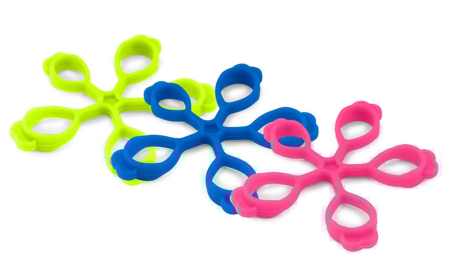 skuteczny gadżet do ćwiczenia mięśni dłoni. Zestaw składa się z trzech gum o zróżnicowanym oporze.