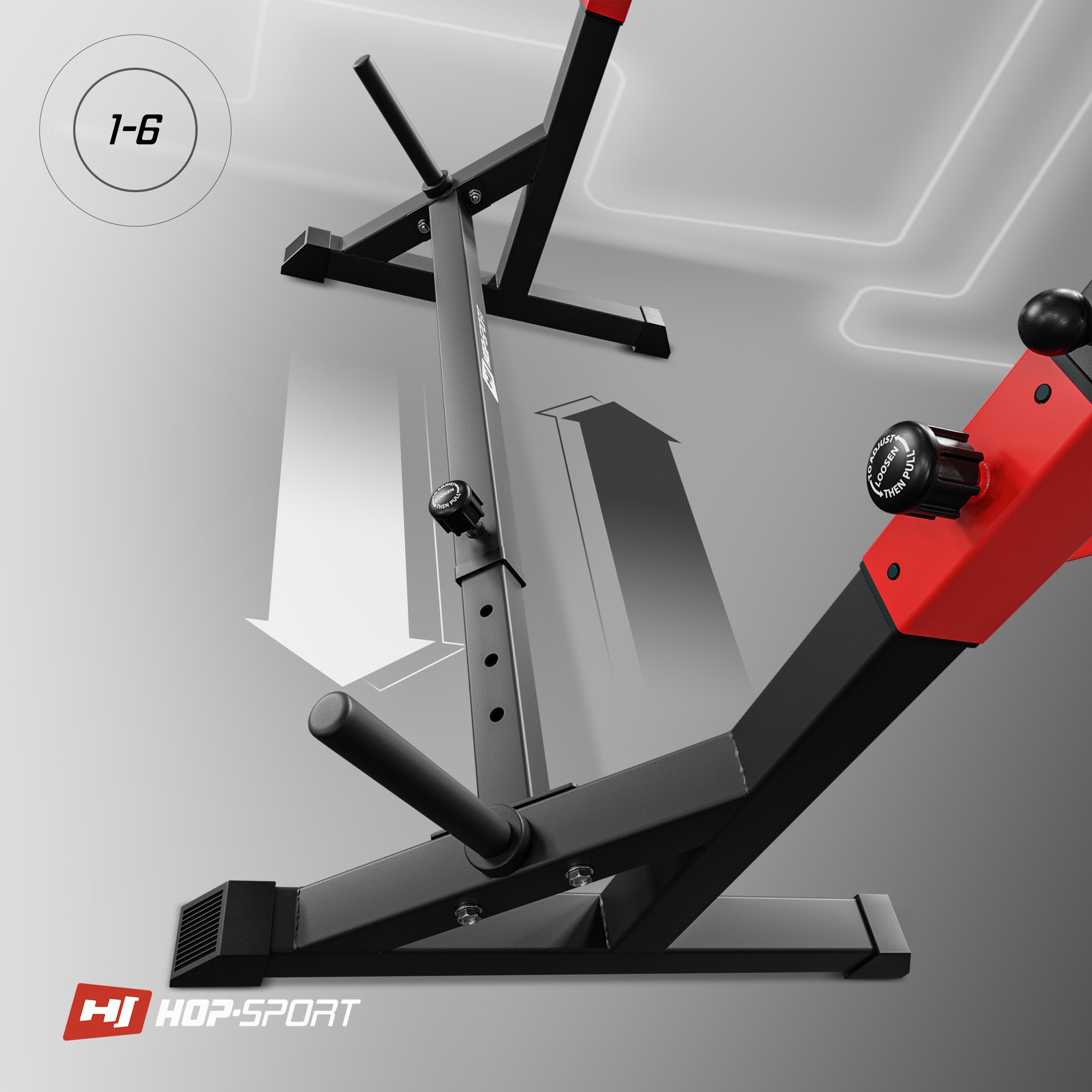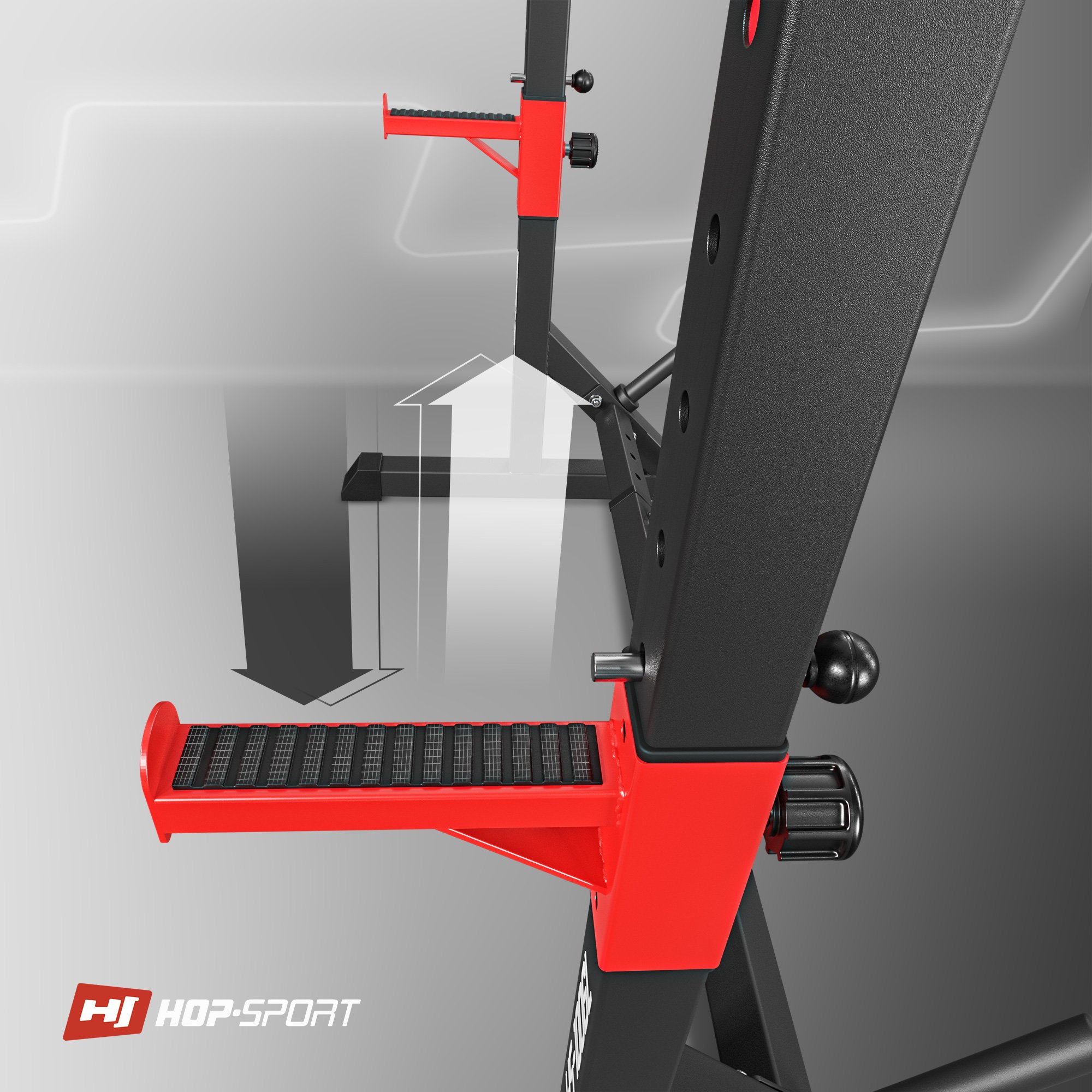 Wysokość stojaków można ustawić na 15 różnych poziomach. Aby zmienić wysokość należy odkręcić pokrętła, ustawić stojaki na pożądanej wysokości i z powrotem zakręcić końcówki. Dzięki regulacji stojaki z powodzeniem można używać do innych ćwiczeń niż wyciskanie: stojaki ustawione z odłożoną na nich sztangą na najwyższej wysokości mogą być użyte np. do podciągania się i odwrotnego wiosłowania.