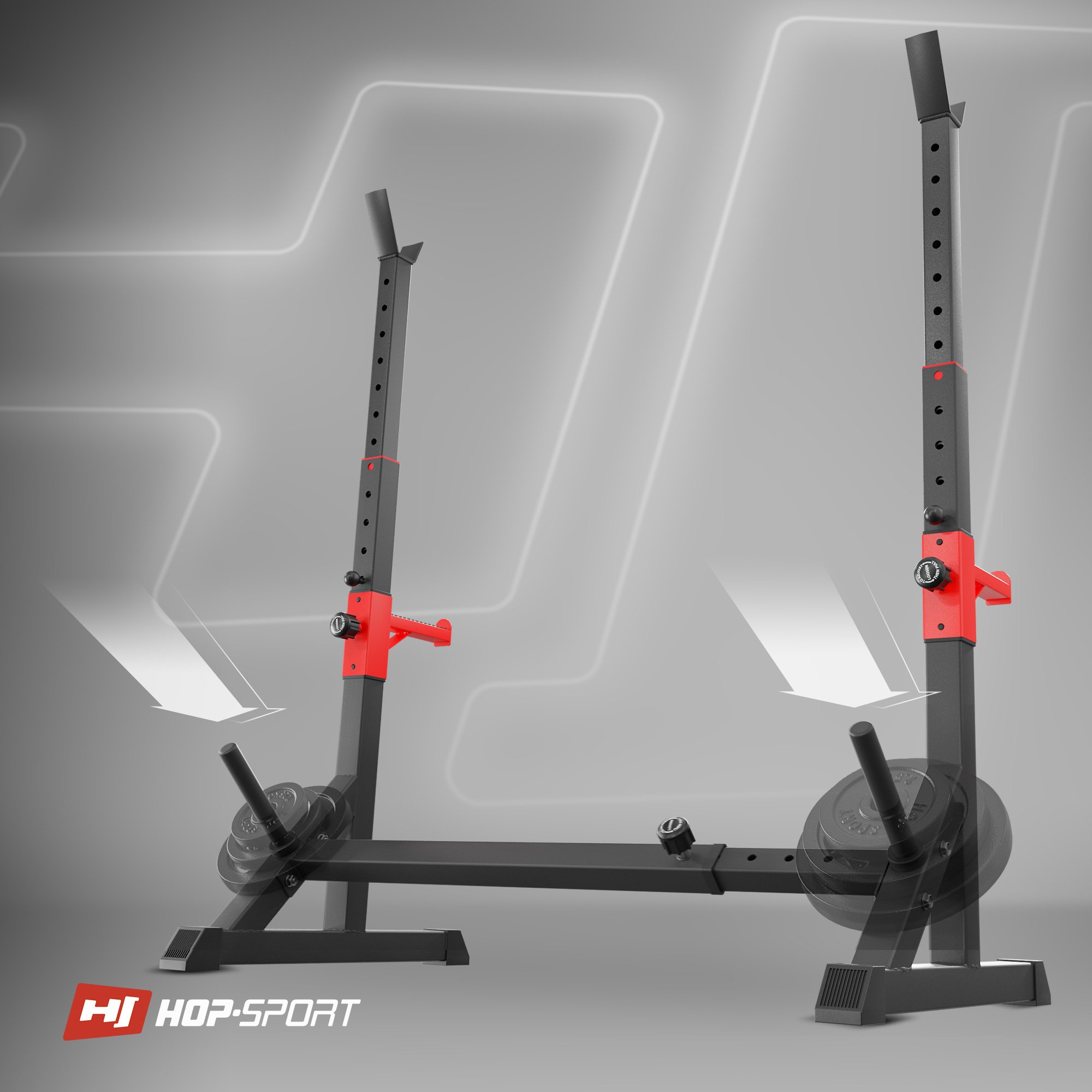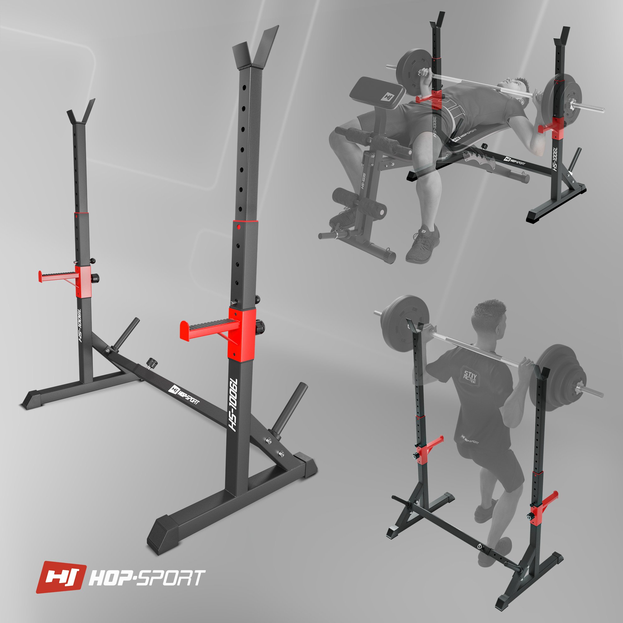 Stojaki HS-1006L są bardzo wytrzymałe. Mocne stalowe profile o przekroju 50x50 mm oraz grube blachy, łączące poszczególne elementy, zapewniają stojakom stabilność. Stojaki osiągają wytrzymałość do 200kg. Zastosowanie techniki malowania proszkowego gwarantuje dokładne pokrycie metalowych powierzchni, zwiększa odporność na uszkodzenia mechaniczne oraz osłabia działanie niekorzystnych czynników, takich jak np. wilgoć. Budowa i wykonanie stojaków HS-1006L gwarantuje, że posłużą długie lata. Ćwicz bezpiecznie i komfortowo razem z Hop-Sport!