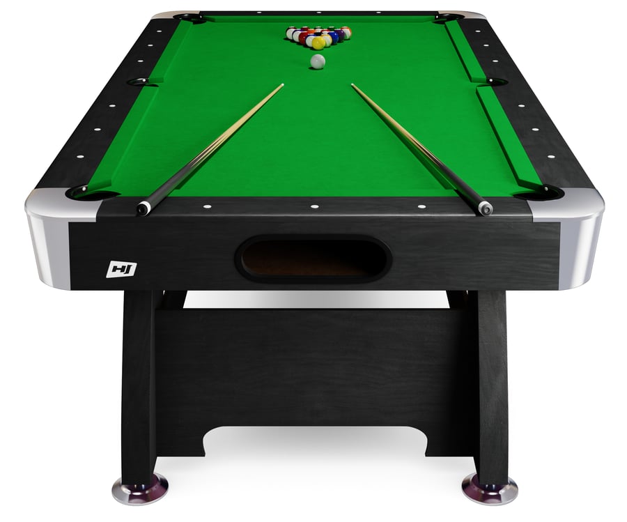 Stół bilardowy z systemem spływowym Hop-Sport Vip Extra 8ft czarny z suknem zielonym, w zestawie akcesoria do gry.