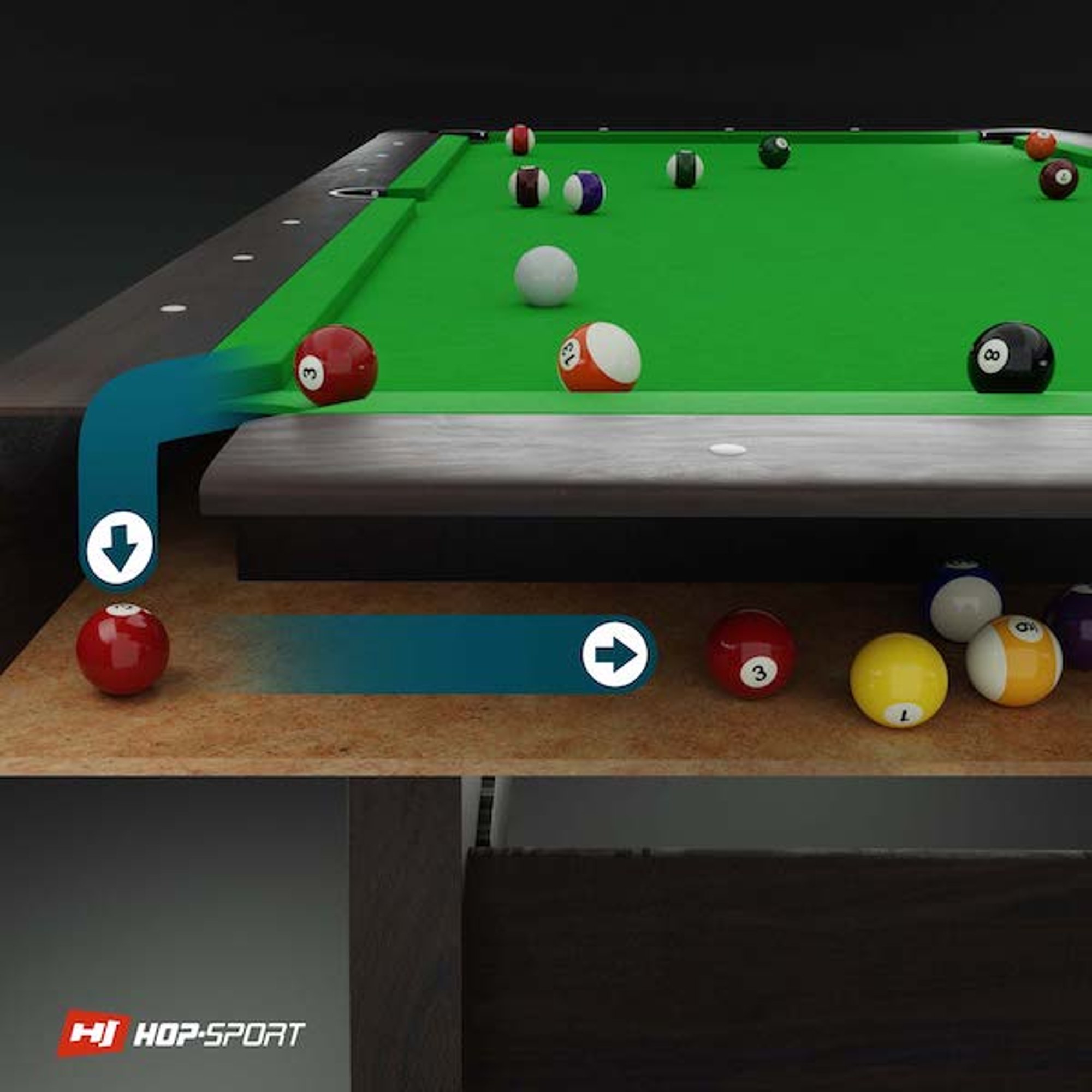 Dzięki zastosowaniu tego systemu, bile gromadzą się pod stołem w jednym miejscu. Łuzy bilardowe wykonane z twardej gumy a pojemnik na spływające bile wyścielany jest pianką, która tłumie odgłosy wtaczających się bil.