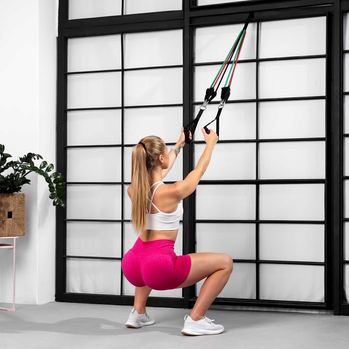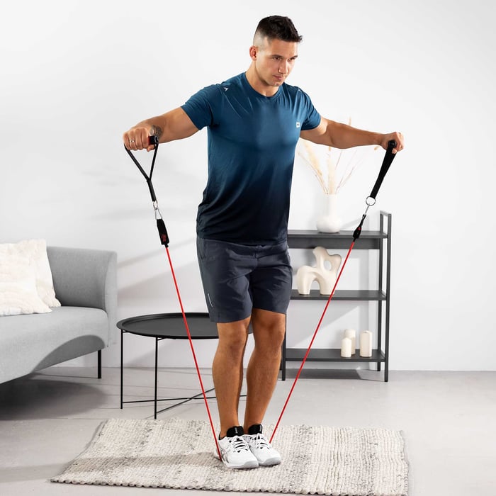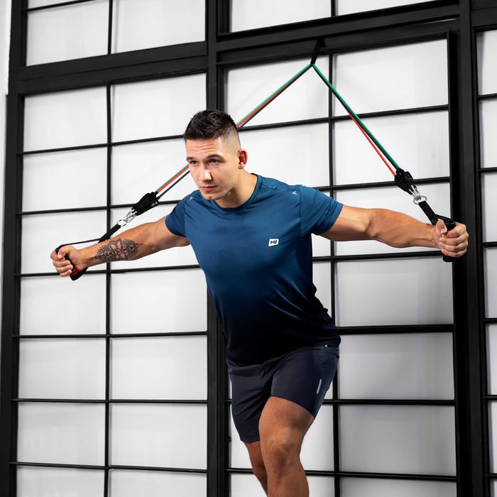 Zestaw ekspanderów HS-R050RT zapewni Ci trening całego ciała. Poza tym, że stanowi skuteczne narzędzie do modelowania ramion, klatki piersiowej i pleców, dzięki dołączonym do zestawu paskom na kostki umożliwia także wykonanie treningu nóg. Taki trening pomoże Ci wzmocnić w szczególności stawy skokowe i kolana.