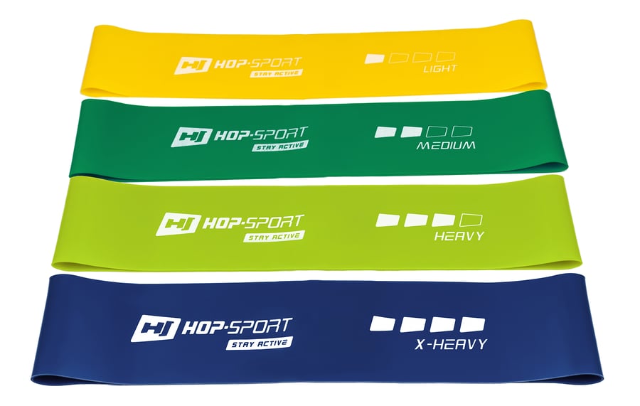 Zasada działania taśm oporowych polega na tym, że im mocniej je rozciągasz, tym większy generują opór. Dzięki temu możesz z łatwością dopasować obciążenie do etapu treningu, na którym właśnie się znajdujesz. Każda z czterech gum, zawartych w zestawie HS-L550RL, generuje inny zakres obciążenia – żółta 2-3 kg, ciemnozielona 2,5-3,5 kg, jasnozielona 3-4 kg, niebieska 4-7 kg.