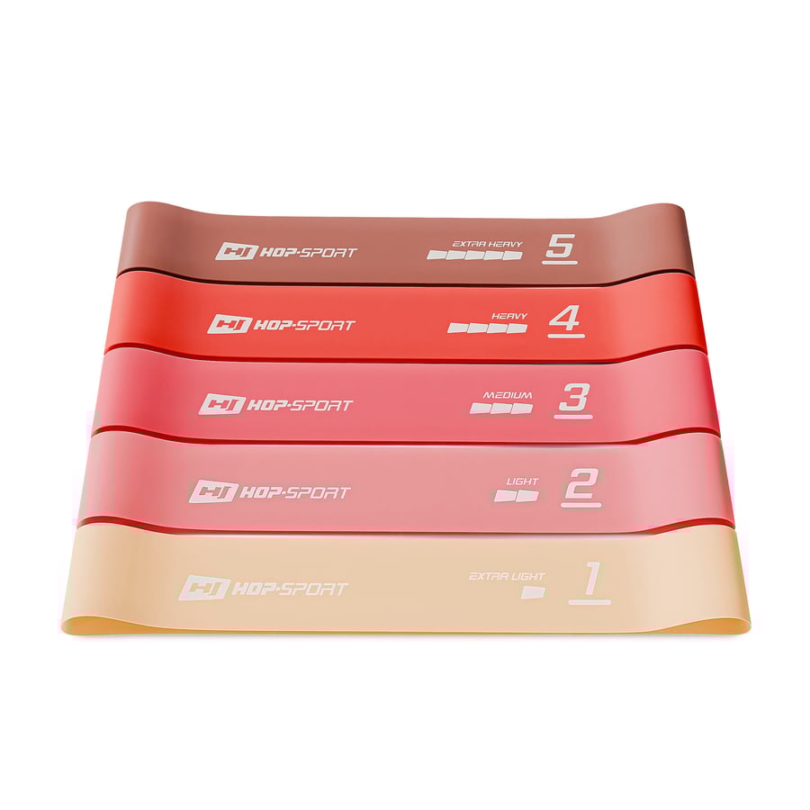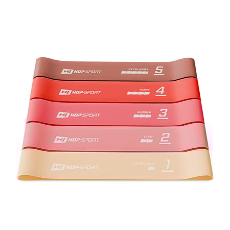 Zasada działania taśm oporowych polega na tym, że im mocniej je rozciągasz, tym większy generują opór. Dzięki temu z łatwością dopasujesz obciążenie do etapu treningu, na którym właśnie się znajdujesz. Każda z pięciu gum, zawartych w zestawie HS-L650RLR generuje inny zakres obciążenia – kolejno od najjaśniejszej do najciemniejszej: 2,5-4,5 kg, 4,5-7 kg, 7-9 kg, 11-14 kg, 14-18 kg.