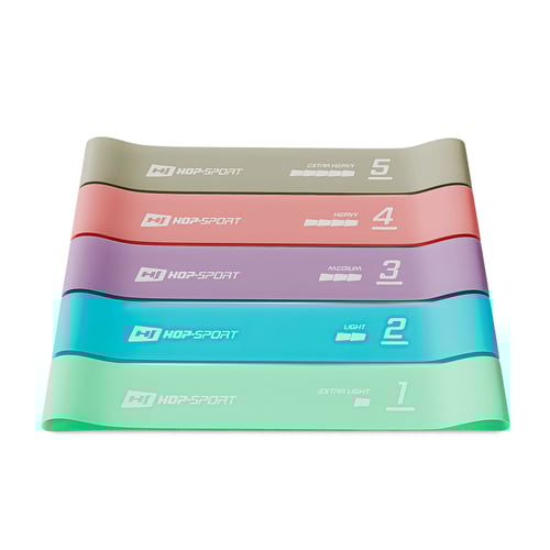 Zasada działania taśm oporowych polega na tym, że im mocniej je rozciągasz, tym większy generują opór. Dzięki temu z łatwością dopasujesz obciążenie do etapu treningu, na którym właśnie się znajdujesz. Każda z pięciu gum, zawartych w zestawie HS-L650RLL generuje inny zakres obciążenia – kolejno od najjaśniejszej do najciemniejszej: 2,5-4,5 kg, 4,5-7 kg, 7-9 kg, 11-14 kg, 14-18 kg.