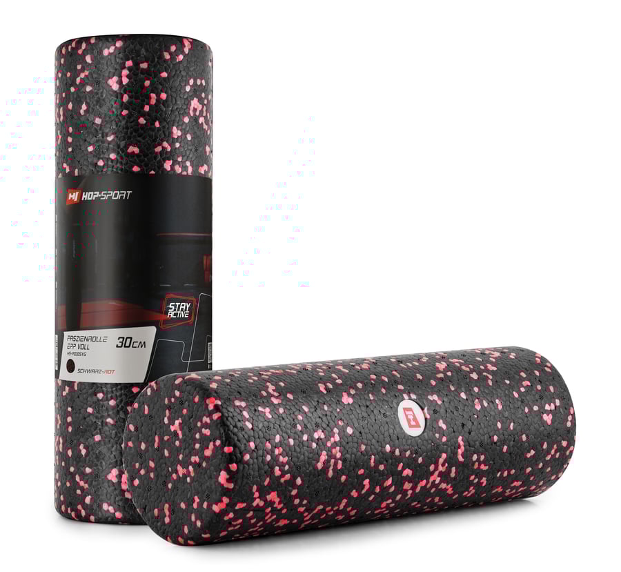 Roller do masażu 30 cm pełny czarno-czerwony. Pomaga w rozluźnieniu i regeneracji mięśni. Roller z wodoodpornej i wysokiej jakości wytrzymałej pianki EPP.