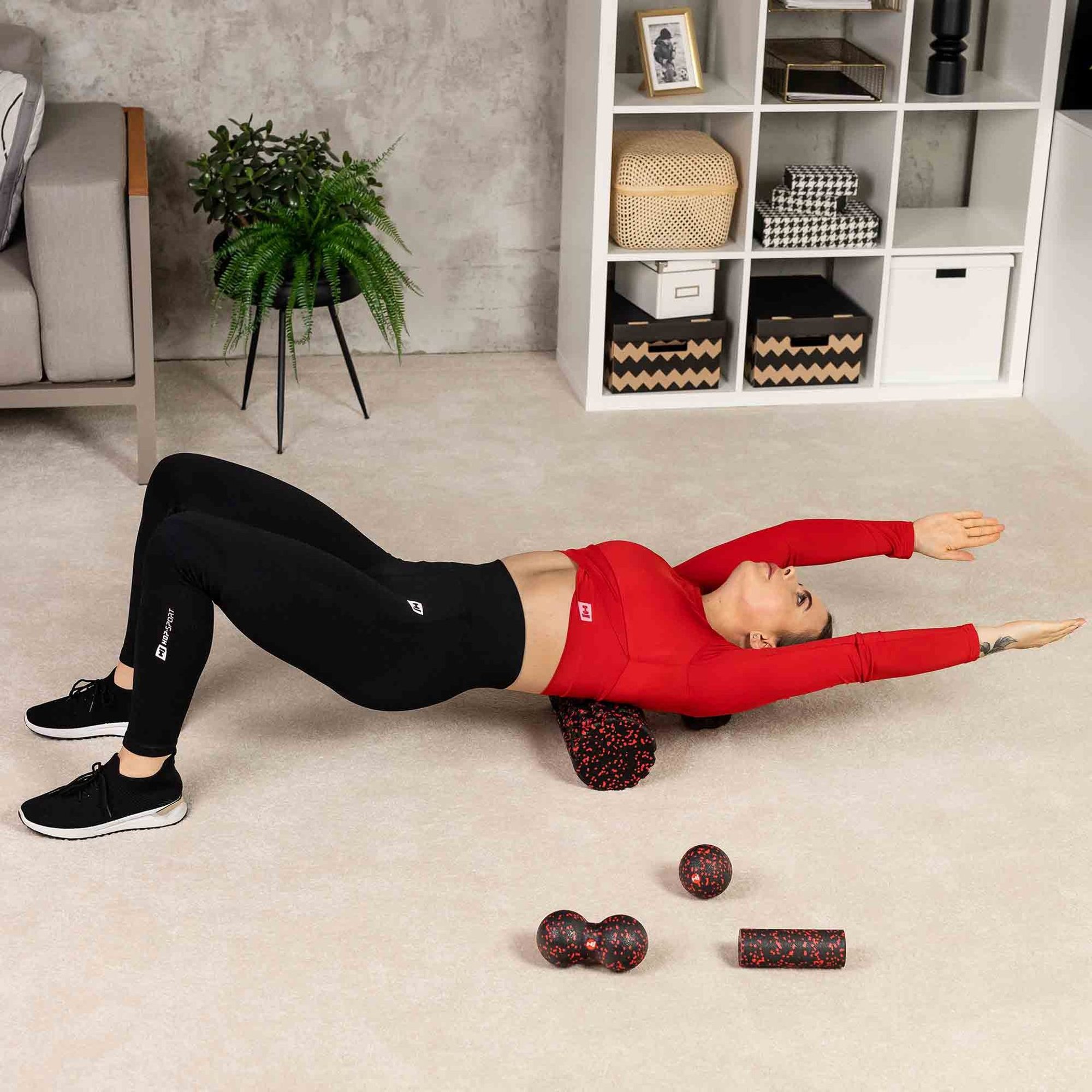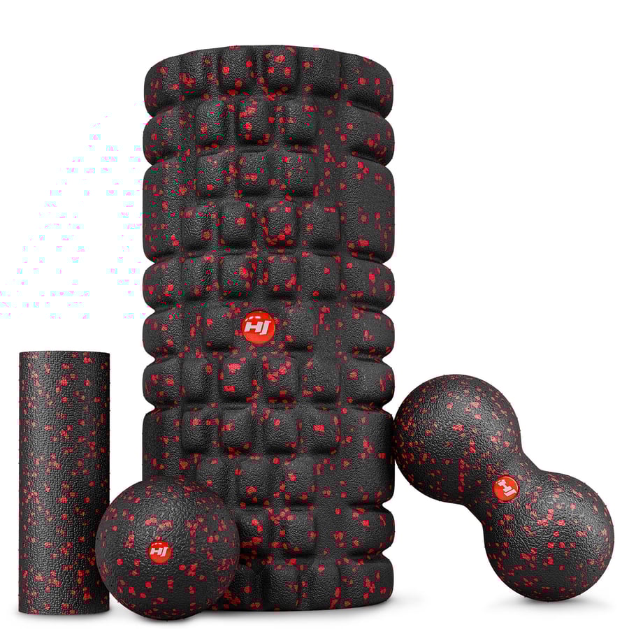 Zestaw akcesoriów do masażu całego ciała w kolorze czarno-czerwonym. Doskonały do rozluźniania mięśni po treningu, łagodzenia bólu i redukcji stresu.