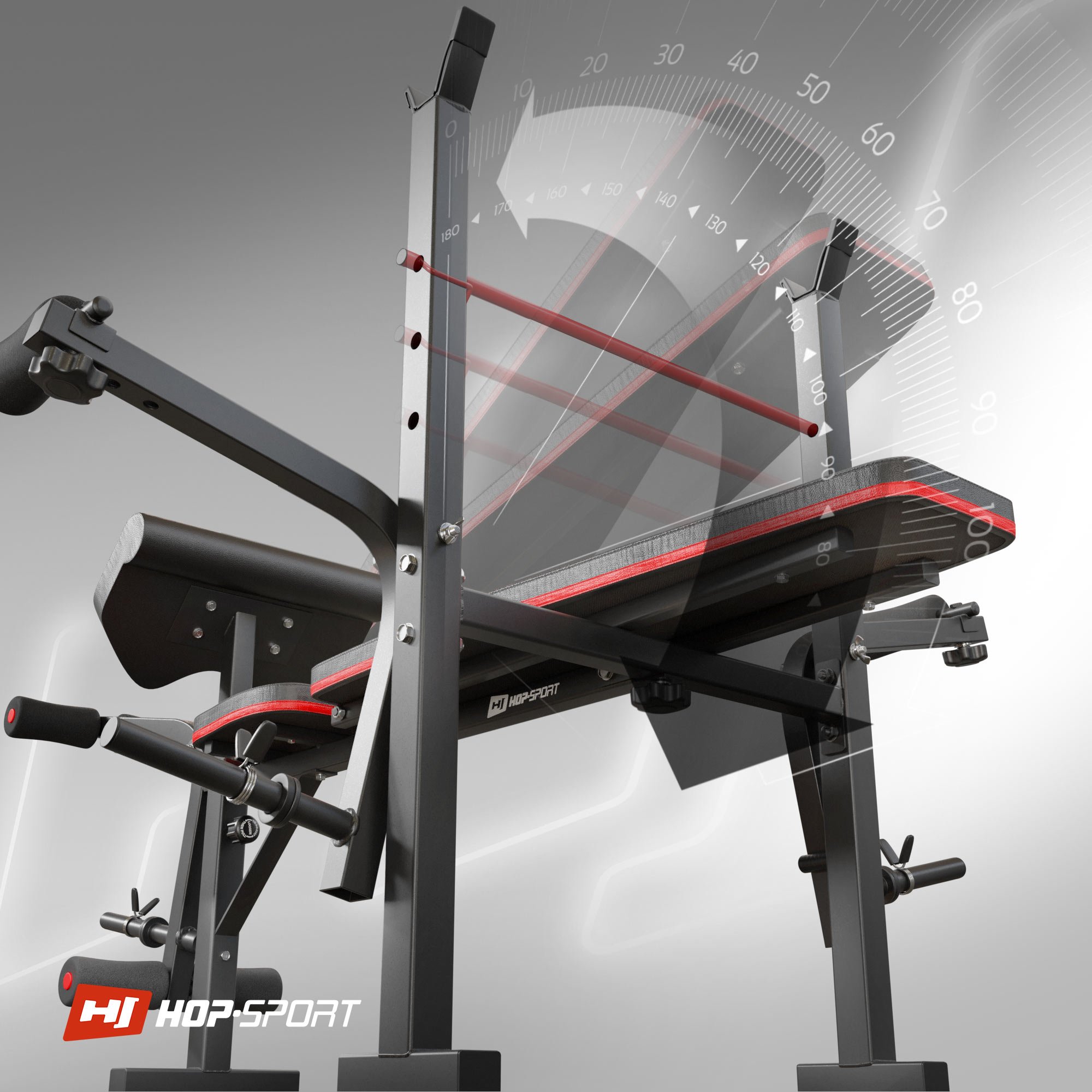 Zestaw 106kg z obciążeniem żeliwnym, pełnymi gryfami ze stali oraz wielofunkcyjną ławką z regulowanym modlitewnikiem, stojakami i prasą do nóg HS-1055.